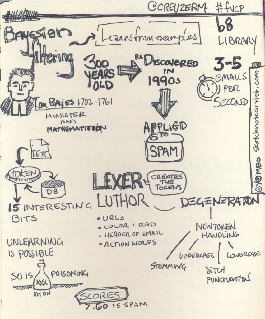 One of the attendees does what’s called sketchnote taking. This is basically doodling notes. He sent me a picture of his notes afterwards, and I immediately thought “That is flipping COOL!” My second thought was “was I THAT boring?” My third thought was, “I wish my presentation was as good as this guy’s notes!”