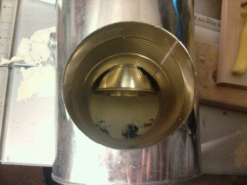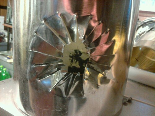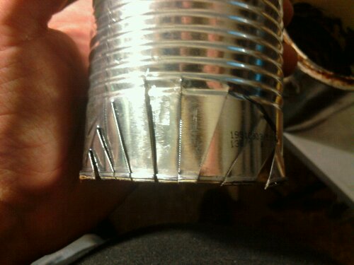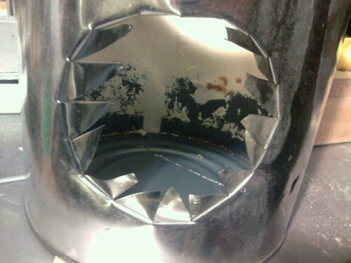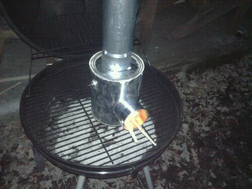 Hopefully tomorrow I can take it apart, see where it got hot, etc. and then finish the Pocket Rocket Heater. I want to add 1 more can to complete the burn chamber, and then pack perlite around it inside the can. I also want to set it up inside the garage so I can heat the garage. I will run it out one of my windows. Stove pipe out the upper part, flexable dryer vent for an air intake coming in the lower part.