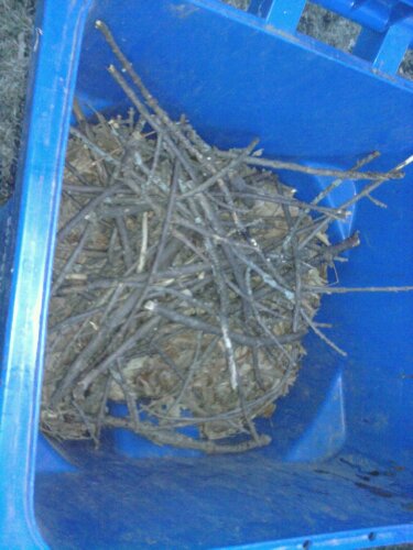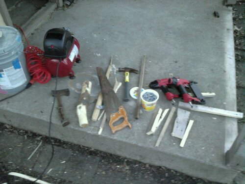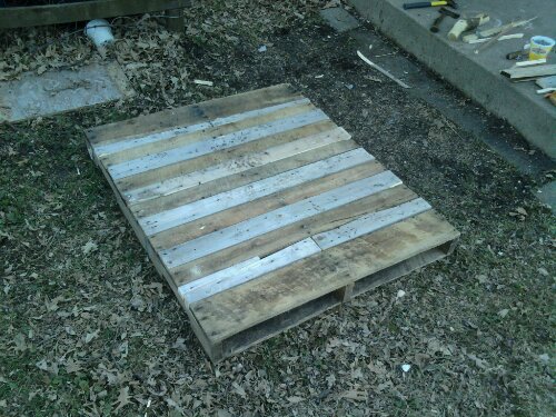 I ‘decked’ the pallet that will face the yard with some scrap wood from a shipping crate I took apart for lumber. The scrap boards where too wide for some of the gaps so I split a bit off with a hatchet – no cutting these nail ridden scraps!
