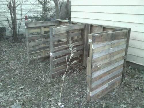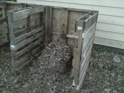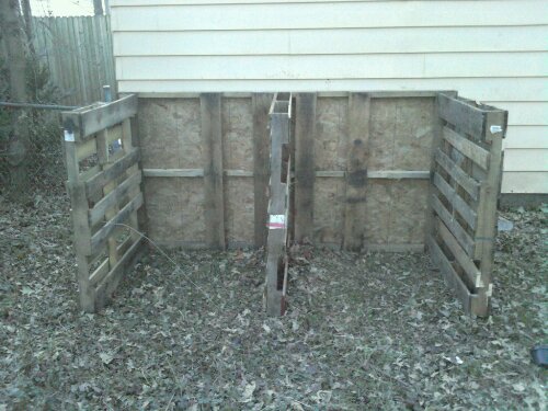 My wife started raking leaves in the back yard today. I figured that means I ought to make the composter I’ve been talking about making for a while now. I’ve accumulated 3 regular pallets and one long ‘double’ pallet in the last year.