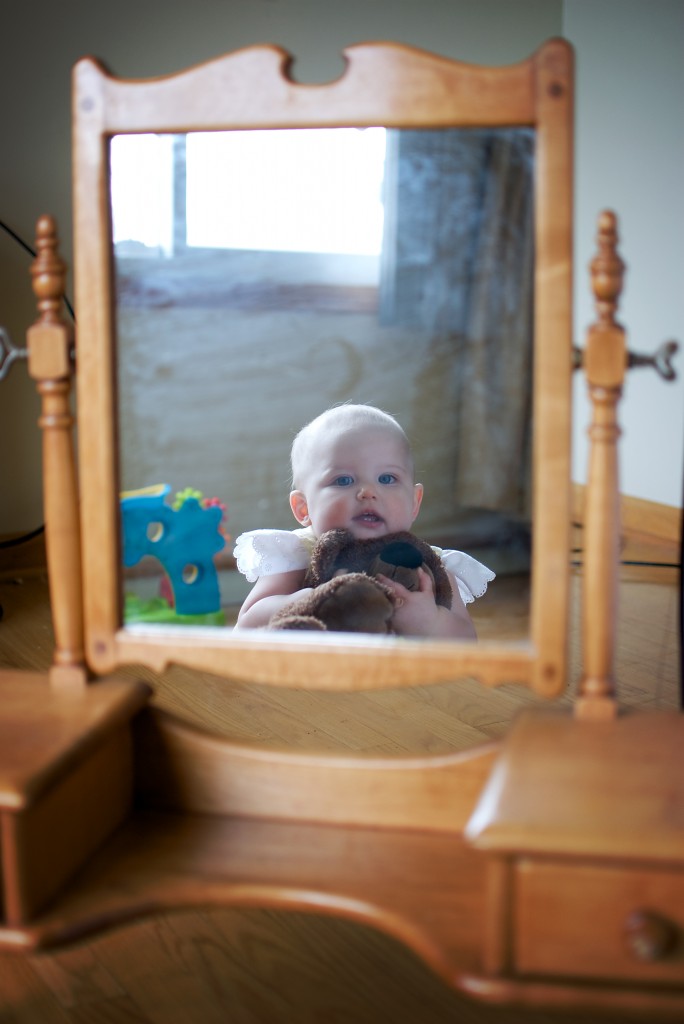 My dad had found this mirror at a garage sale. We put some short legs under it, and it’s one of her more-favorite toys!