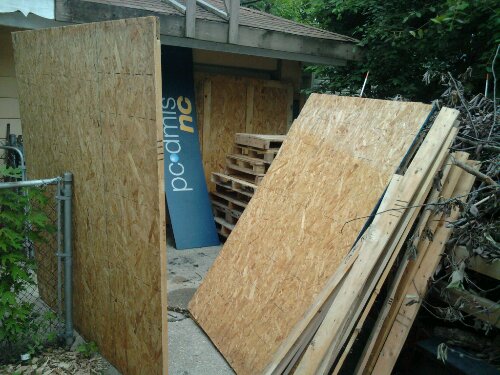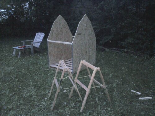A few minutes with a circular saw and I had my two ends! I screwed them to the pallet. I scrounged a few 1-bys to hold the two end walls apart. I cut another sheet down to the side walls. I screwed them on, and it’s looking pretty good, if I say so myself.