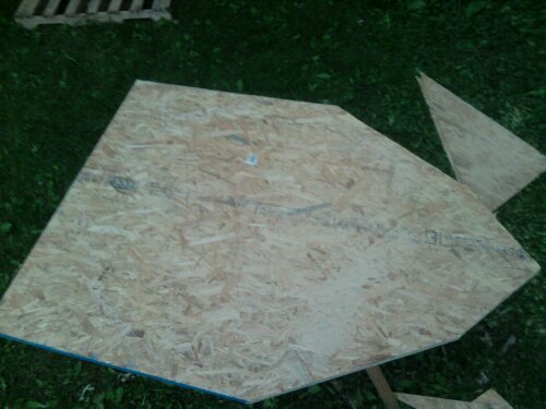 I measured the pallet, and the broken down bits of shipping crate. I grabbed a piece of soap stone and drew out a ‘barn’ shape on a sheet of wood. Katie liked it except it was too tall. So, adjusting it down, I laid two pieces down on a saw horse and measured out my barn sides.