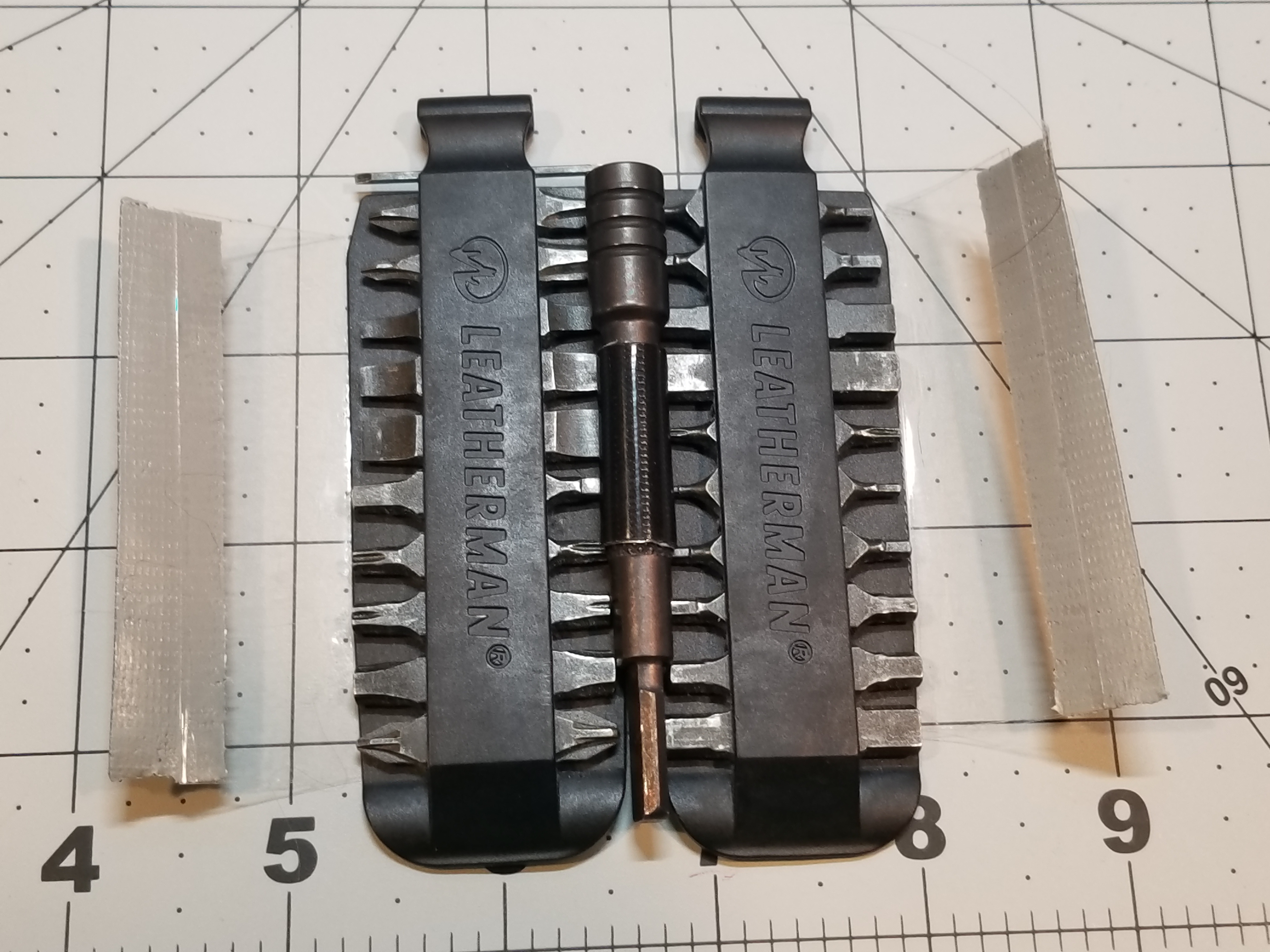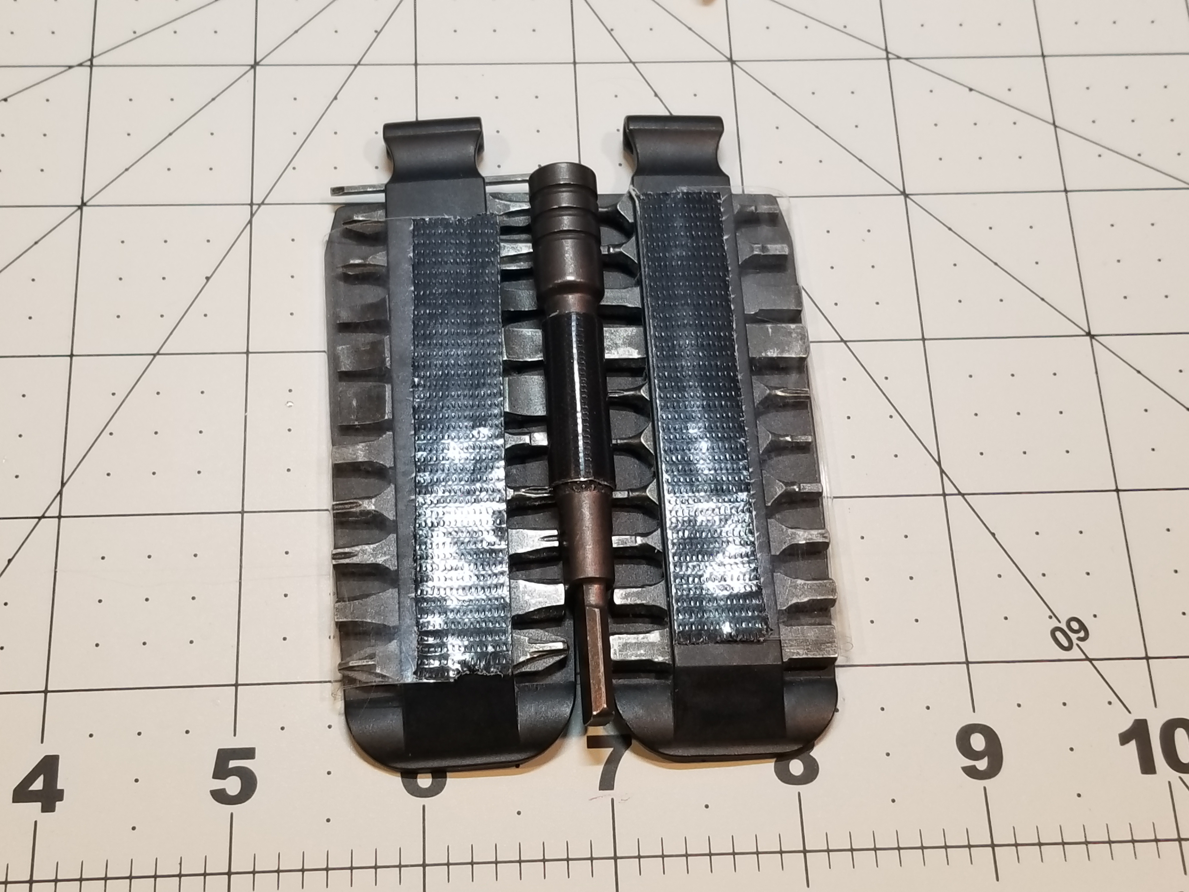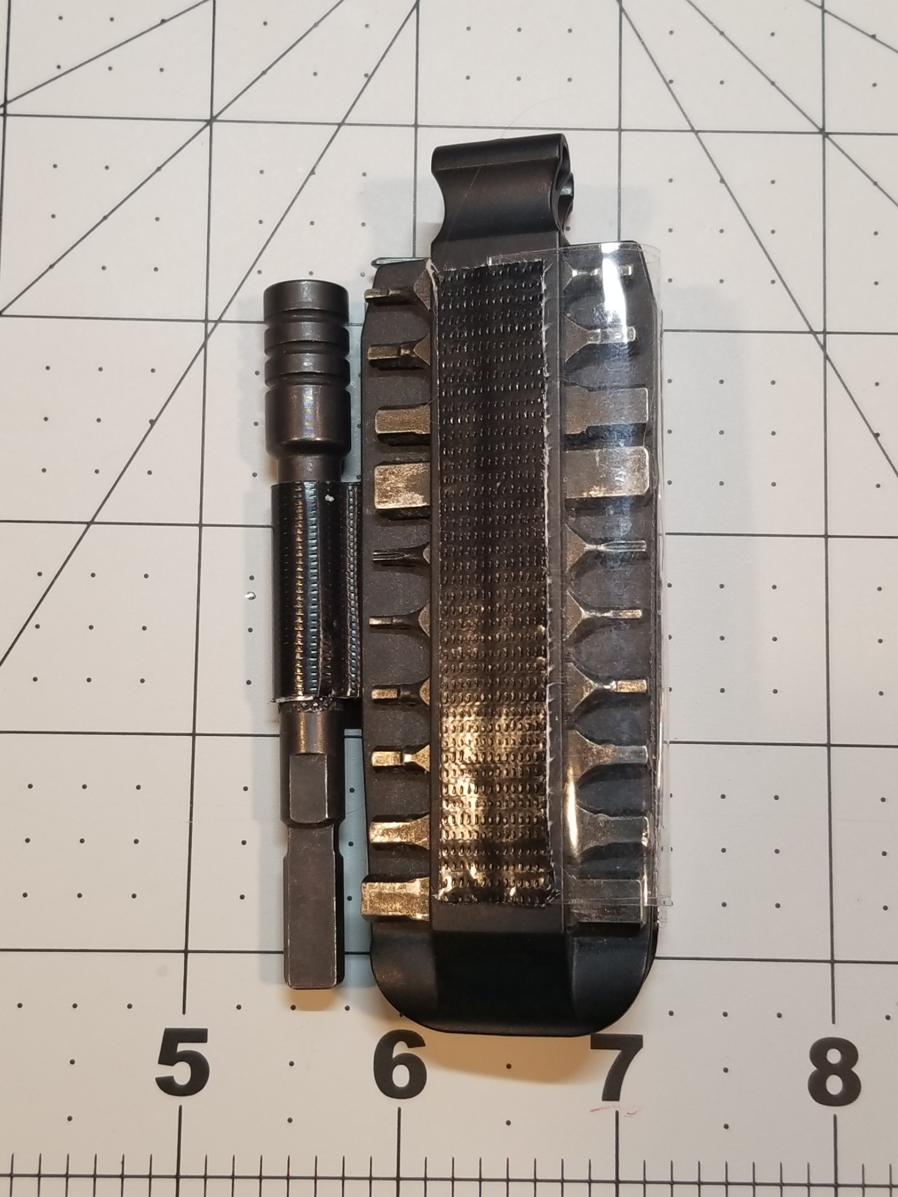 A few minutes with some tape and I have something I think I will like. It sits flat in my pocket, curving to my leg. The bits are easy to access yet are protected from the rest of the contents of my pocket.